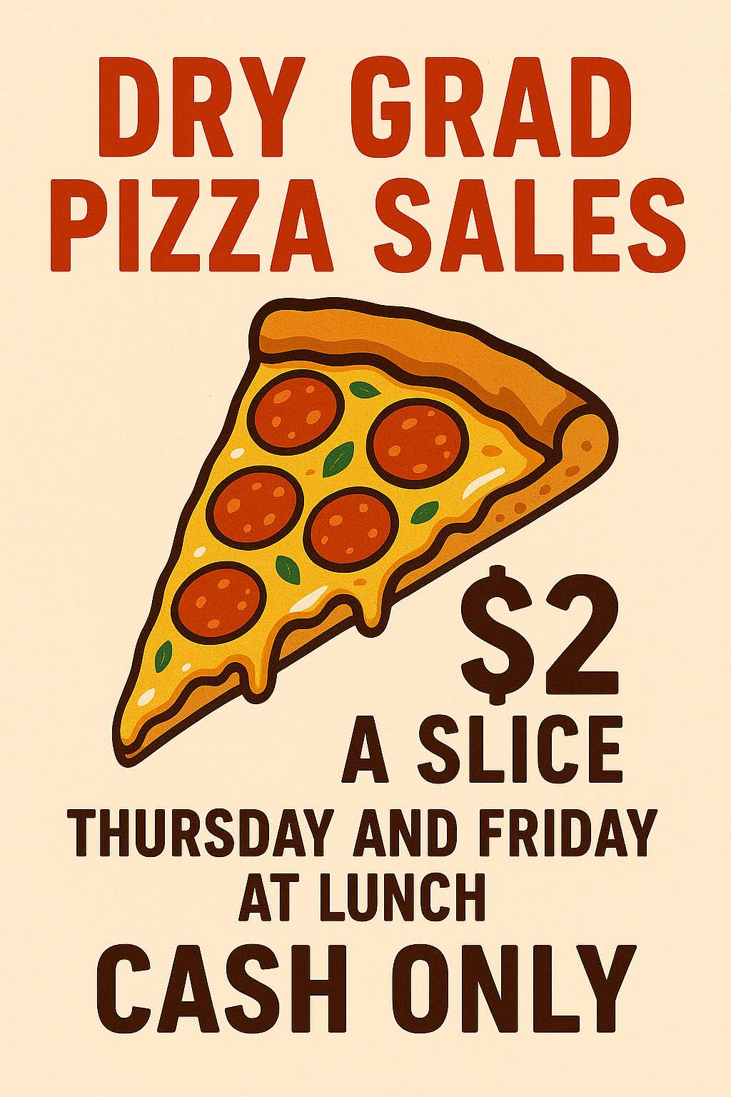 March 13 – Pizza for sale – $2 per slice, cash only