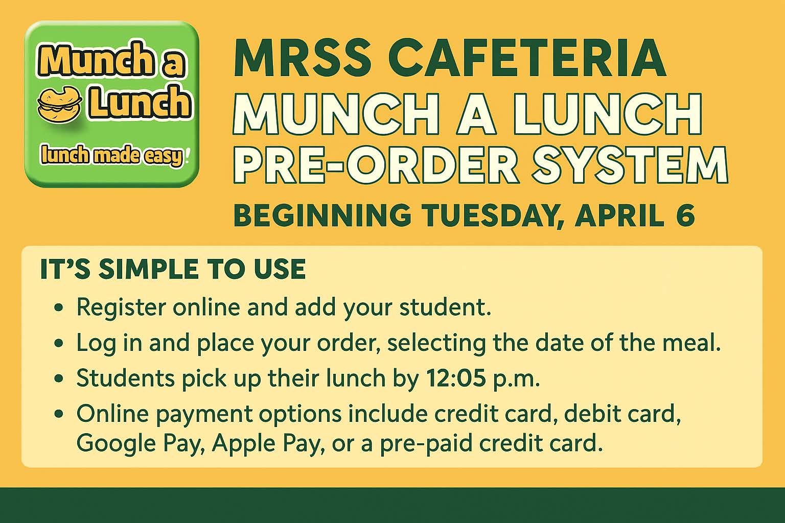 We are super excited to announce that you can now place your student’s lunch order online using MunchaLunch.com! You can pay for your orders online using credit card (Visa/Mastercard), debit-credit card, Google Pay, Apple Pay or pre-paid credit card. It’s super simple! Check your email, the Parent Portal and the MRSS website for all the information!![]() |