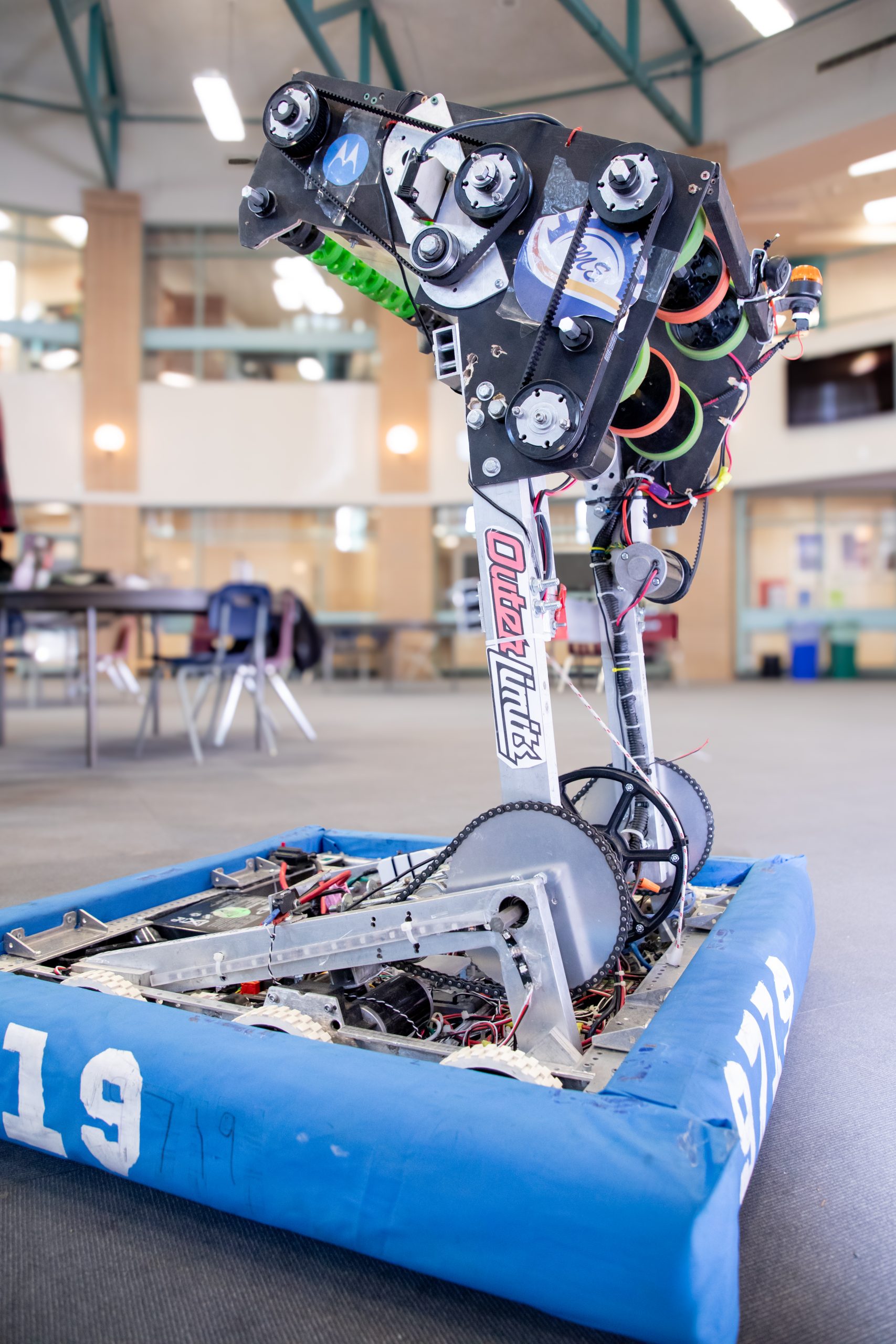 The game is different every year and comes with a 200-page rulebook. This year, the game required robots to pick up foam rings from the ground or a platform and shoot them into targets at different heights. The final challenge was for the robot to hang itself from a chain without touching the ground.