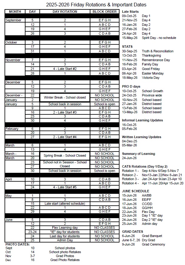 - Student Timetables – Our timetable is still being finalized. Therefore, student timetables will be available in MyEdBC for viewing Friday, August 29. All students will be provided with a copy of their timetable as they arrive at school the first week back. We recommend that students take a photo of their schedule as we no longer have the ‘My School Day’ app.