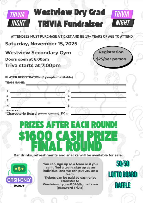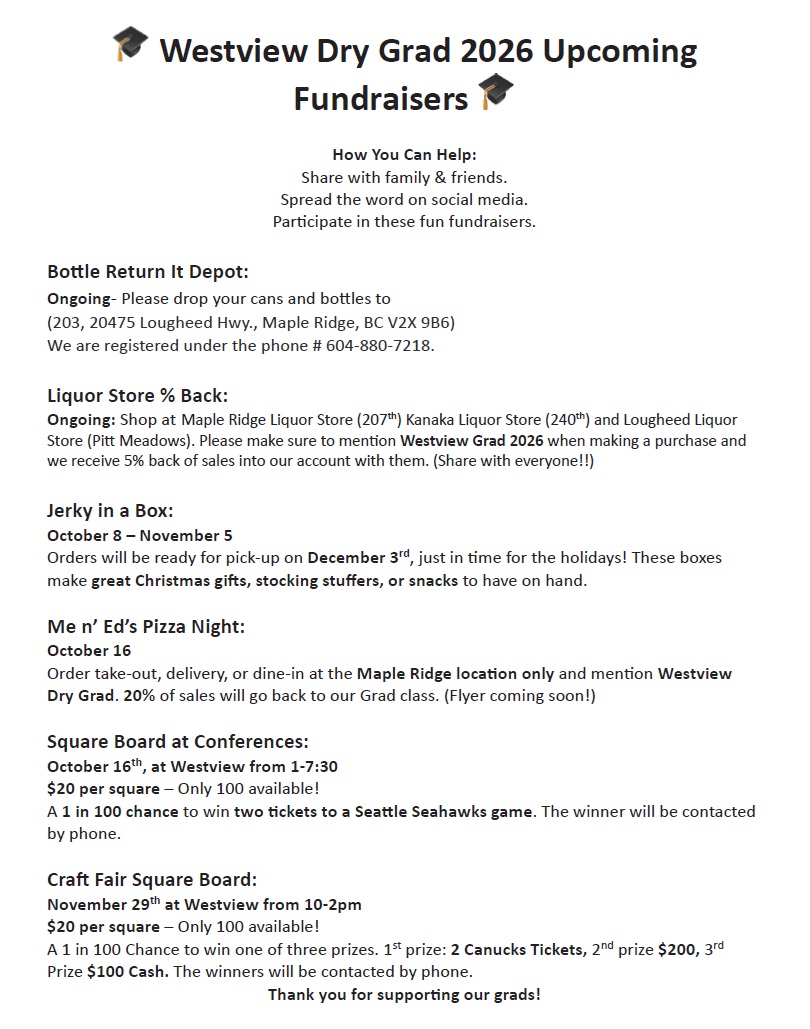 Westview Dry Grad 2026 is hosting the first ever Beef Jerky Fundraiser! There are so many different flavours to choose from, and you can get single packages or even gift boxes. This is the perfect gift or stocking stuffer for your jerky lover in the family or amongst friends. Also great Christmas gift for coaches, teachers and other important people in your kids’ lives.